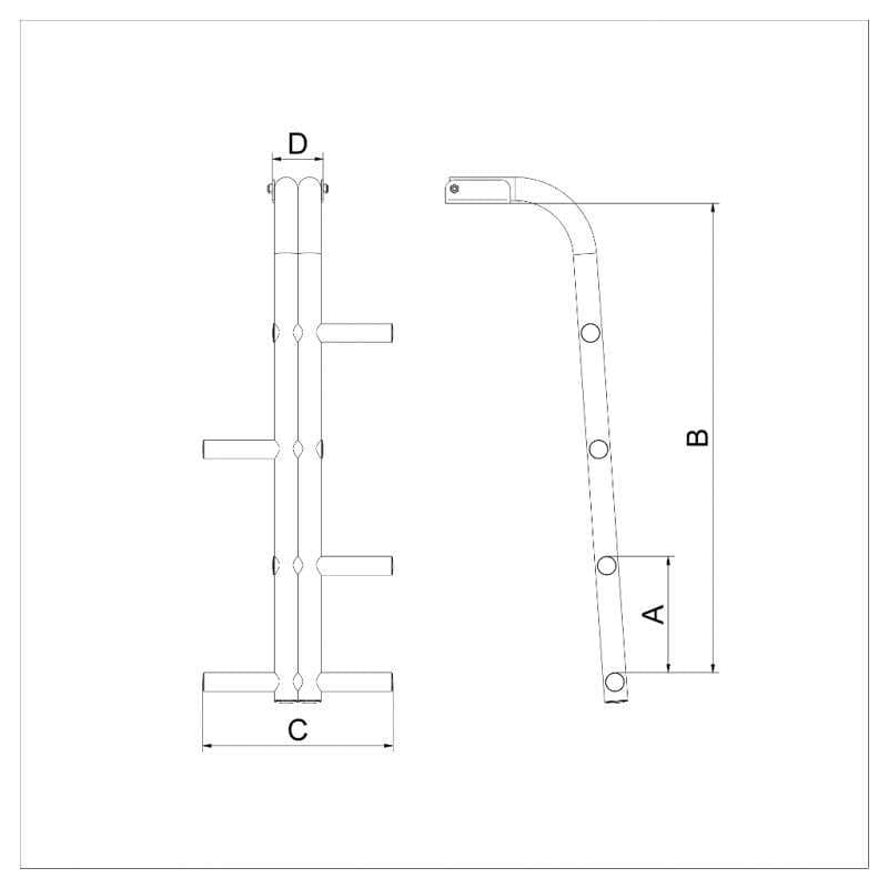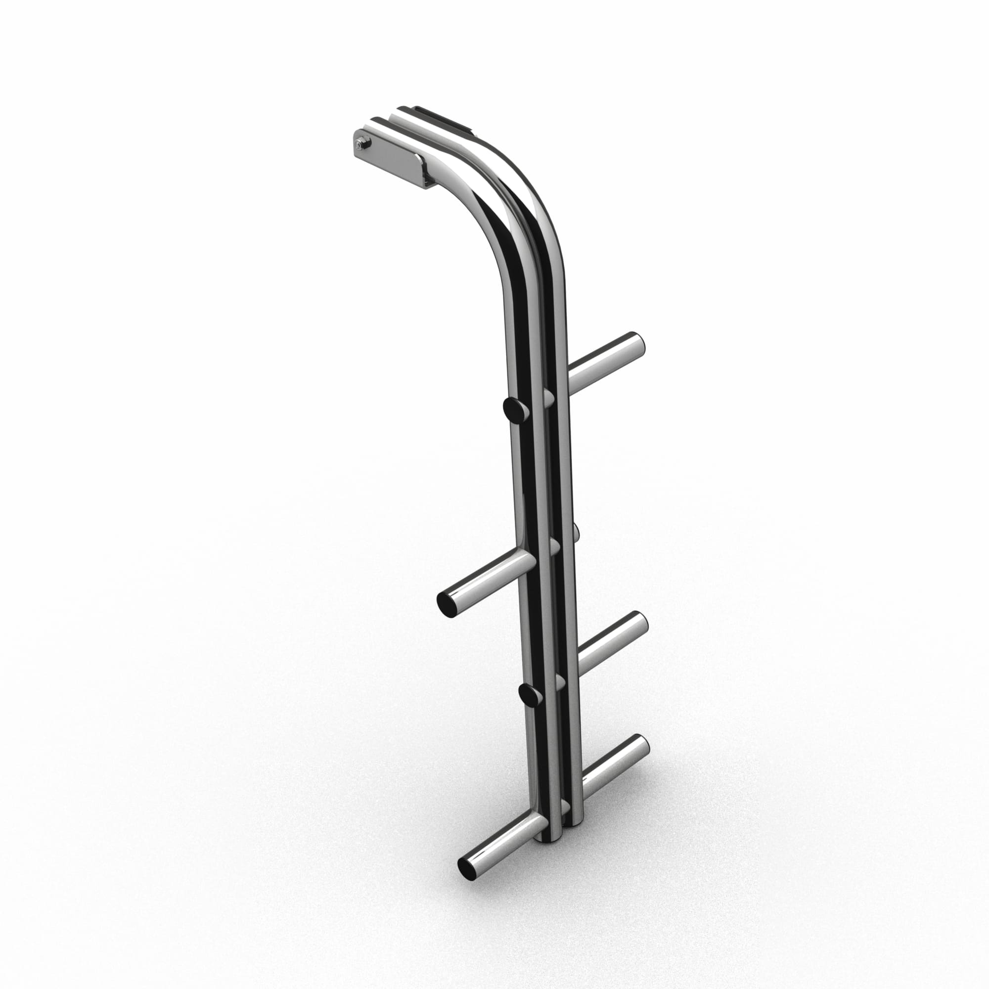 Scala sub ribaltabile con montante in tubo doppio Ø50 di acciaio inox AISI 316L lucidato a specchio per barche e gommoni. Fissaggio sopra-plancia e gradini sfalzati per facilitare la risalita con le pinne. Questa scala non è smontabile quando non in uso.