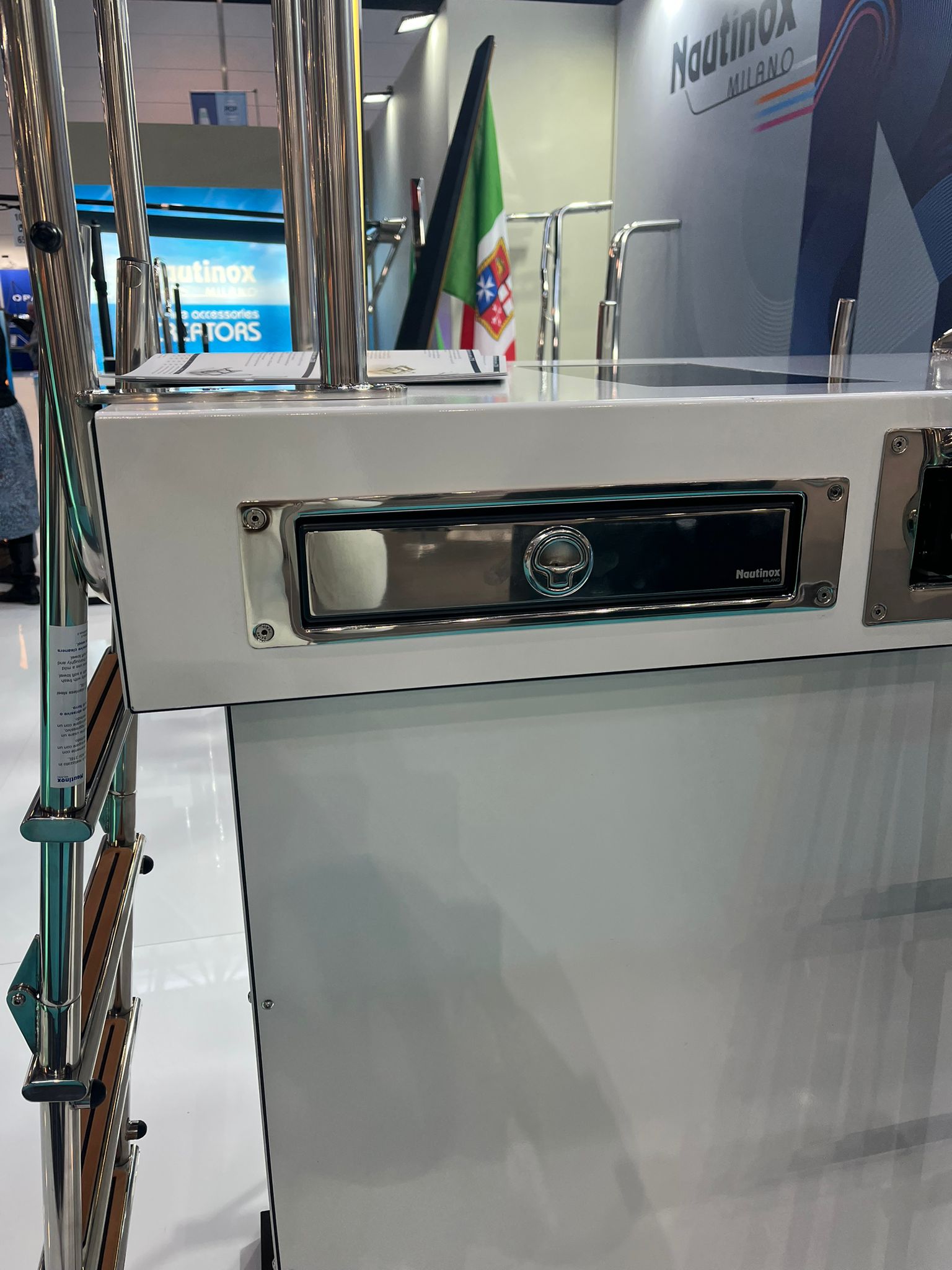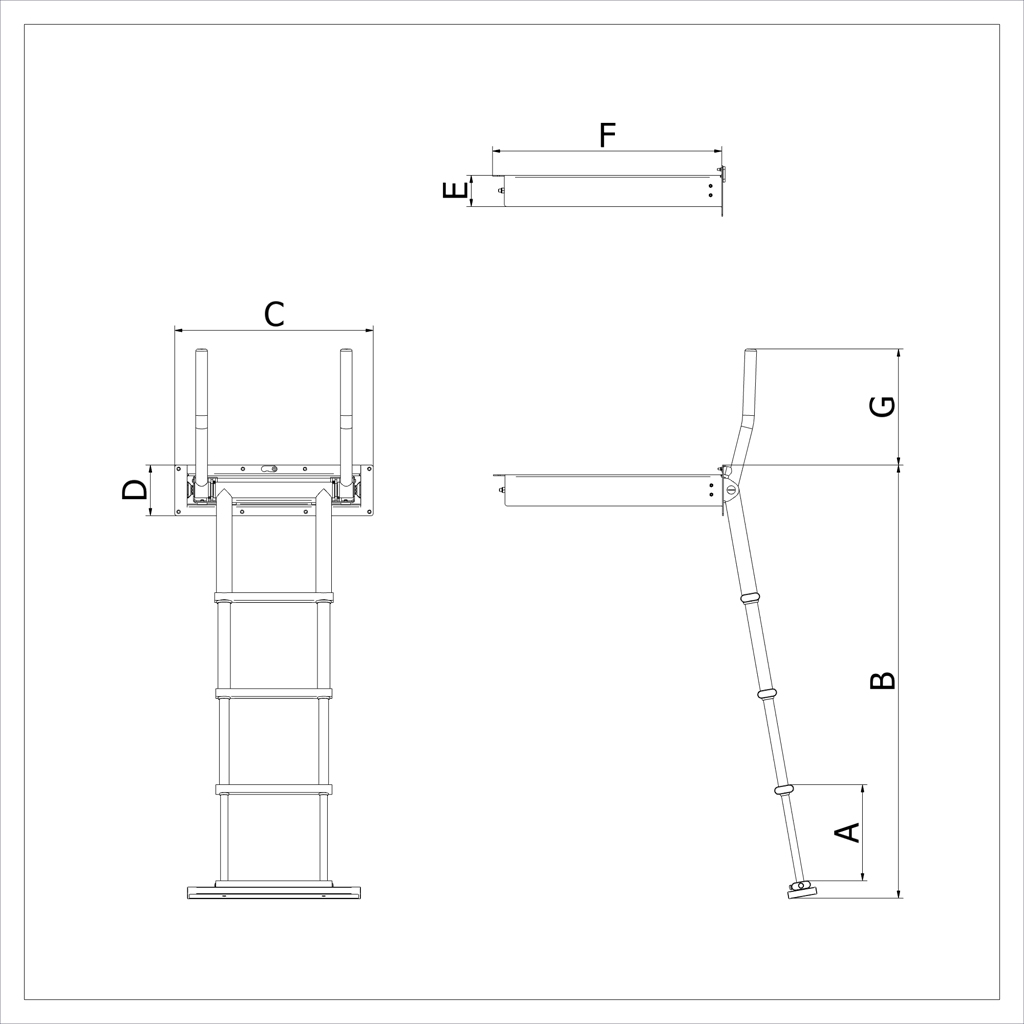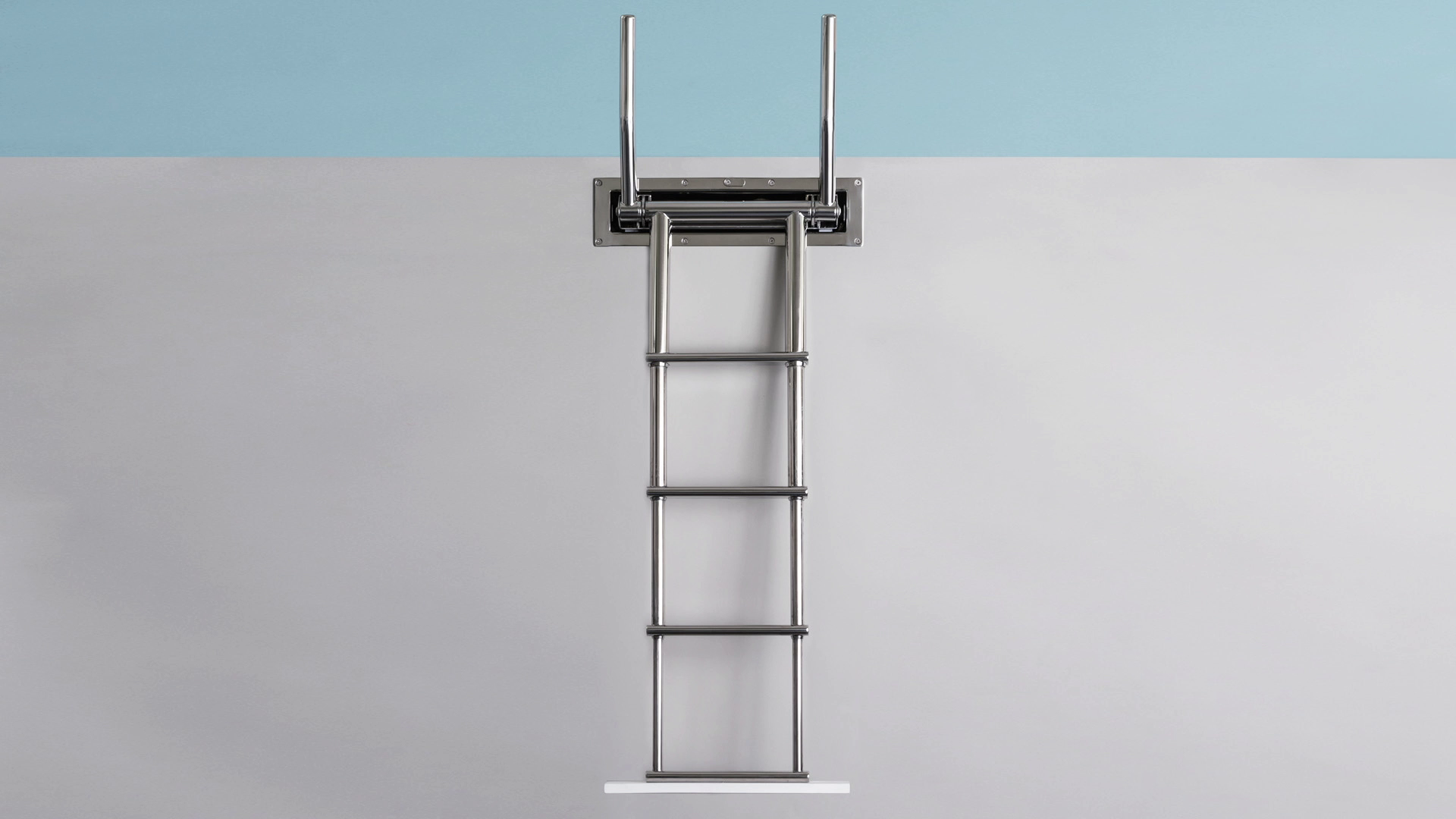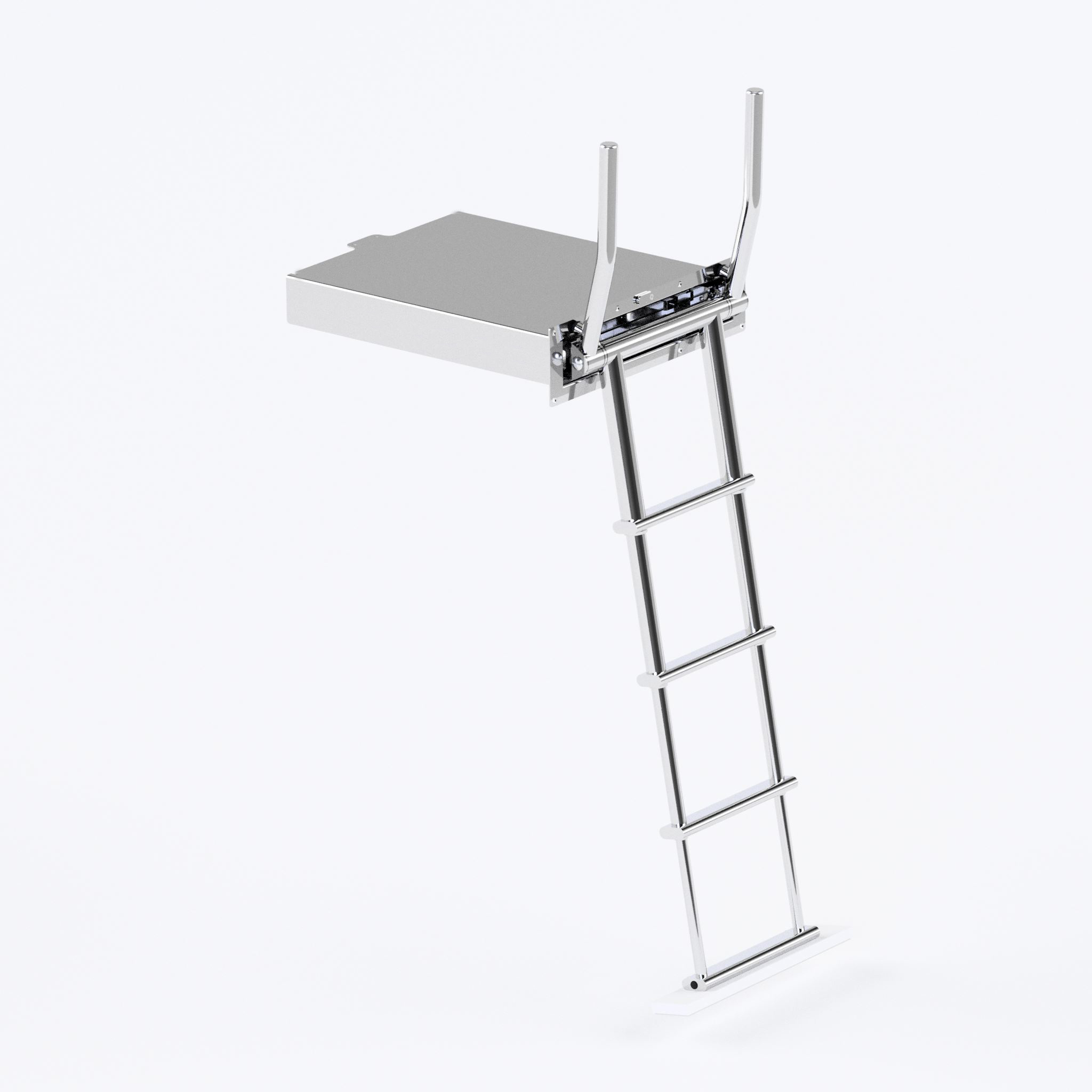 Scala telescopica ad incasso in scatola stagna con maniglie di risalita retrattili a scomparsa. Le maniglie di risalita integrate si alzano ed abbassano automaticamente ruotando la scala, facilitando la risalita dall’acqua ed il recupero della scala aperta dalla plancia. La scatola stagna da incasso richiede uno spazio di montaggio estremamente ridotto è dotata di uno sportello di chiusura per evitare l’apertura accidentale della scala durante la navigazione; è possibile scegliere tra laccio di chiusura oppure maniglia frontale incassata (versione MN) . Peso della scala circa Kg25