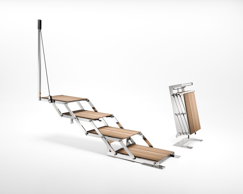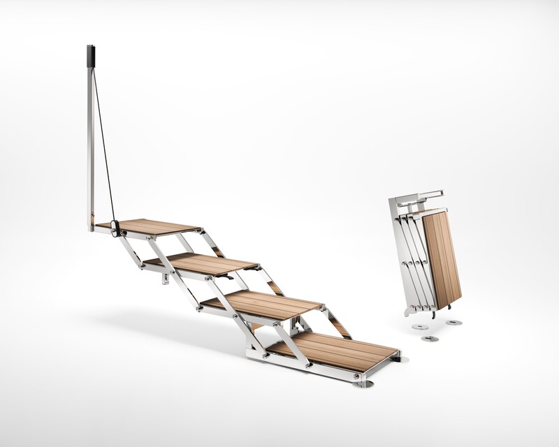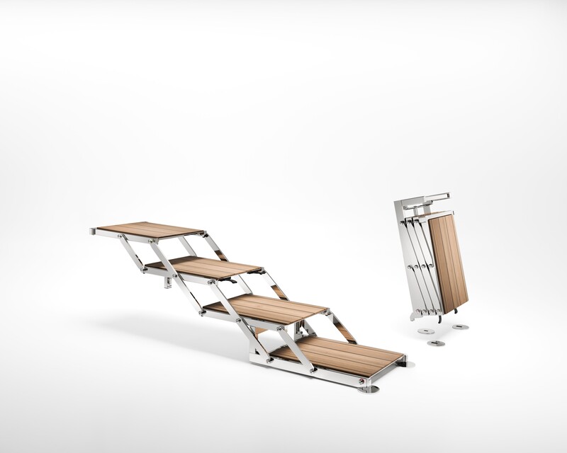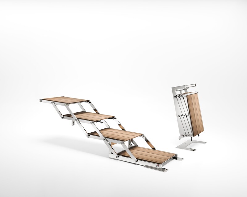 The 4-stage manual telescopic gangway is made of AISI 316L stainless steel and is offered in two different widths. The system is self-standing, does not require support on the dock, and can be easily removed from its fixing point for practical transport or storage (weight: 30 kg). When closed, it takes up very little space (500 mm), but once extended it provides the same room as a traditional 2.5-metre gangway. Designed to ensure safety and ease of use, it can remain installed even while sailing. Removal is not essential, but it becomes useful when you want to completely free up the swim platform or during seasonal storage.
