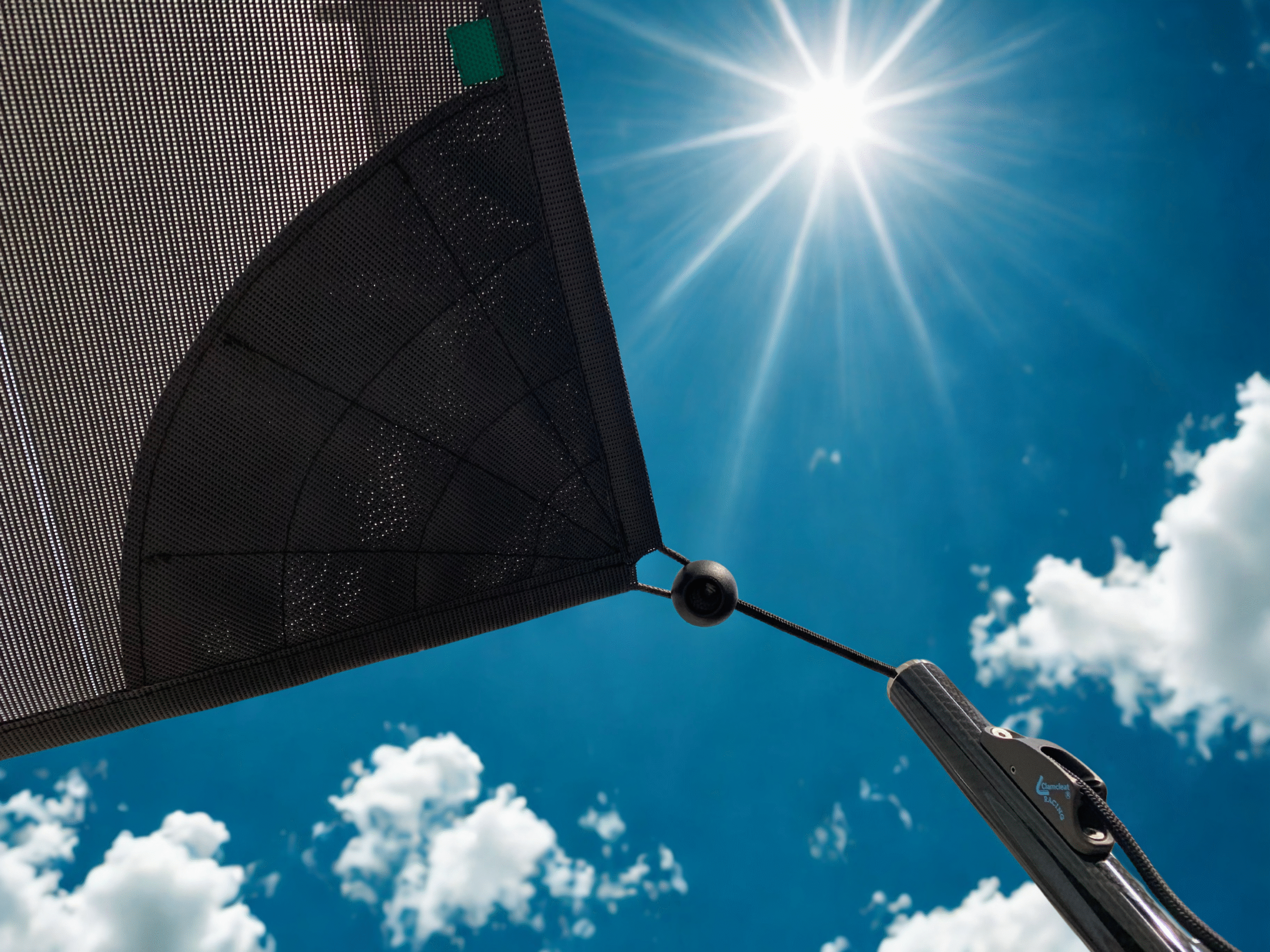 Bimini fastening system: this version has a lateral clamcleat to fasten and tension the bimini.