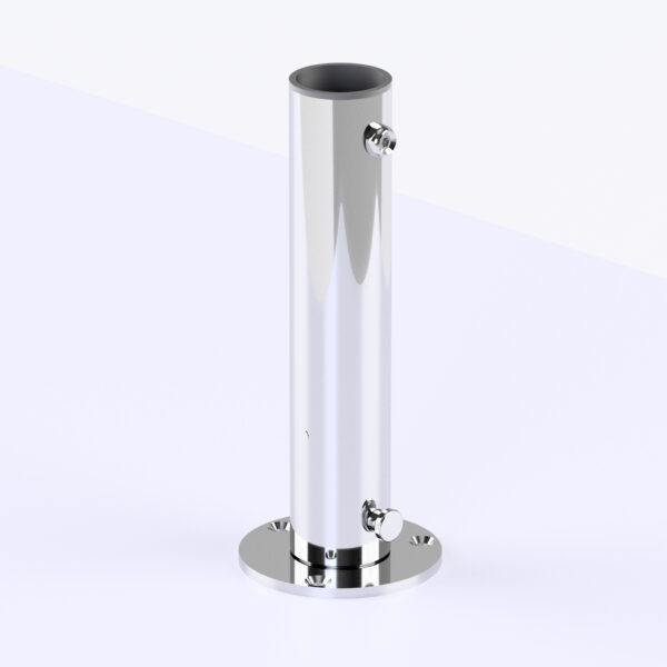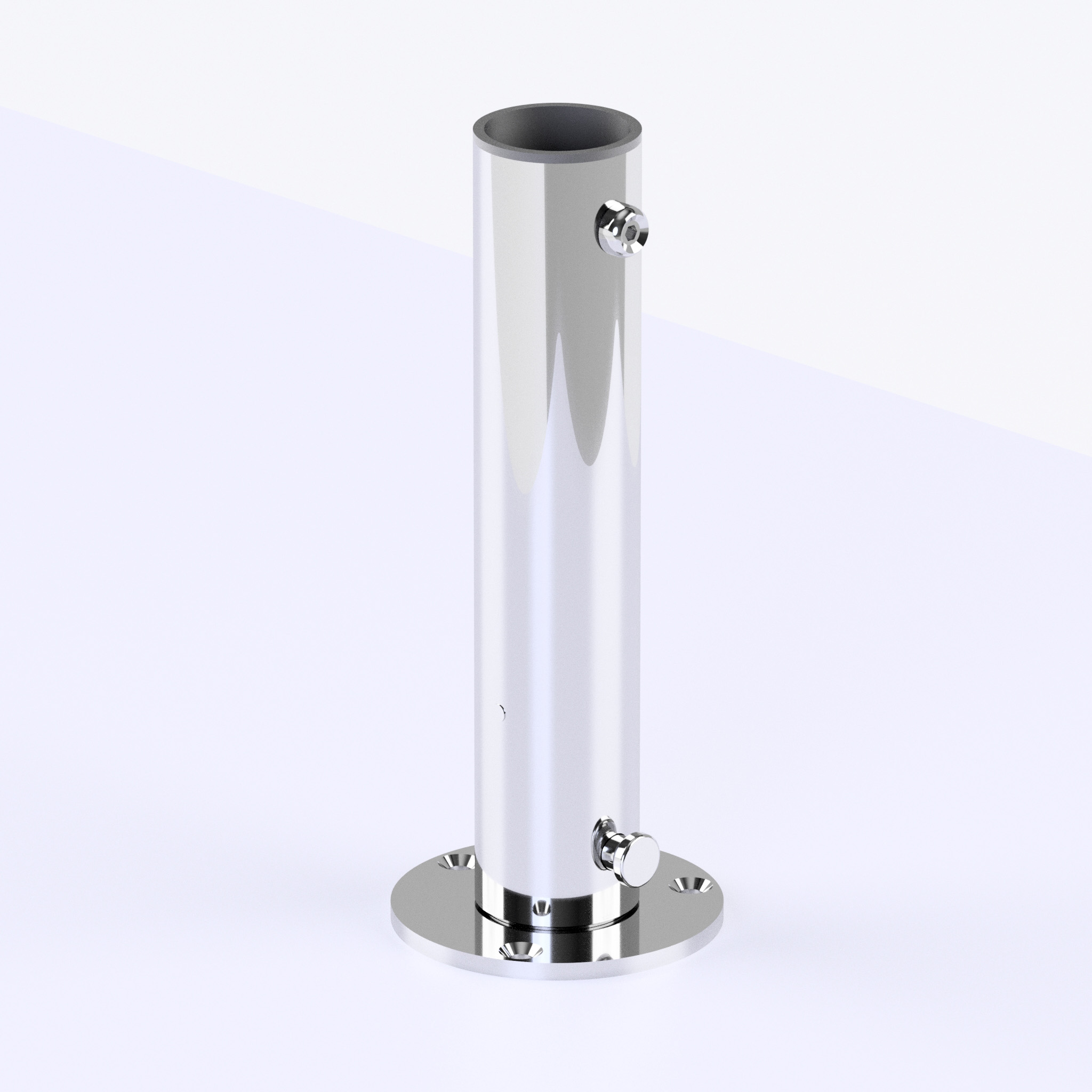 Removable umbrella holder for yacht deck in mirror polished 316L stainless steel Ø45 external for flush mount socket #1820. It can accommodate umbrellas up to external pipe Ø38 maximum. The umbrella holder has a release button to easily remove it from its fixing socket and allows 3 locking/unlocking positions where the padlock symbol is engraved. We suggest keeping the umbrella holder mounted on the umbrella for faster use. The quick-fit socket is made of mirror-polished 316L stainless steel and can be flush-mounted in the deck, it’s available with visible screws (1820/A) or hidden screws (1820/B). The socket features a self closing cap: when you pull out the umbrella holder, the socket closes automatically; when you insert the umbrella holder in, the cap disappears inside the socket. The bottom part of the socket is available with draining pipe for commercial fittings set up or completely watertight.