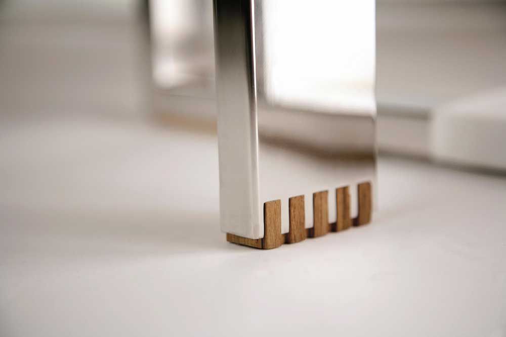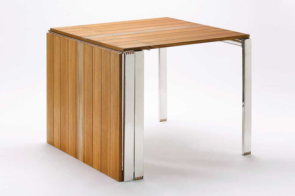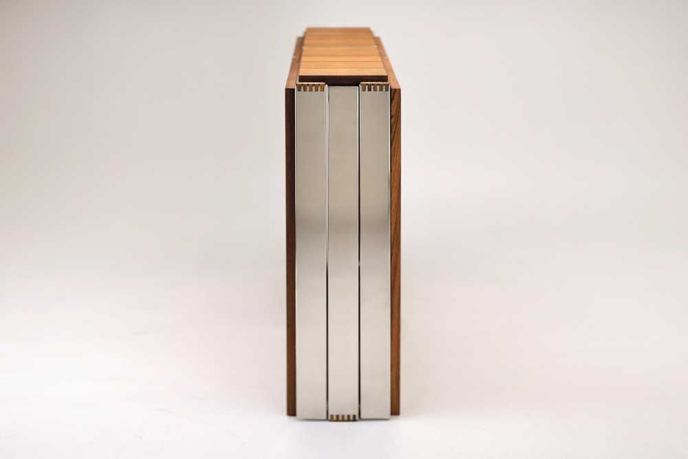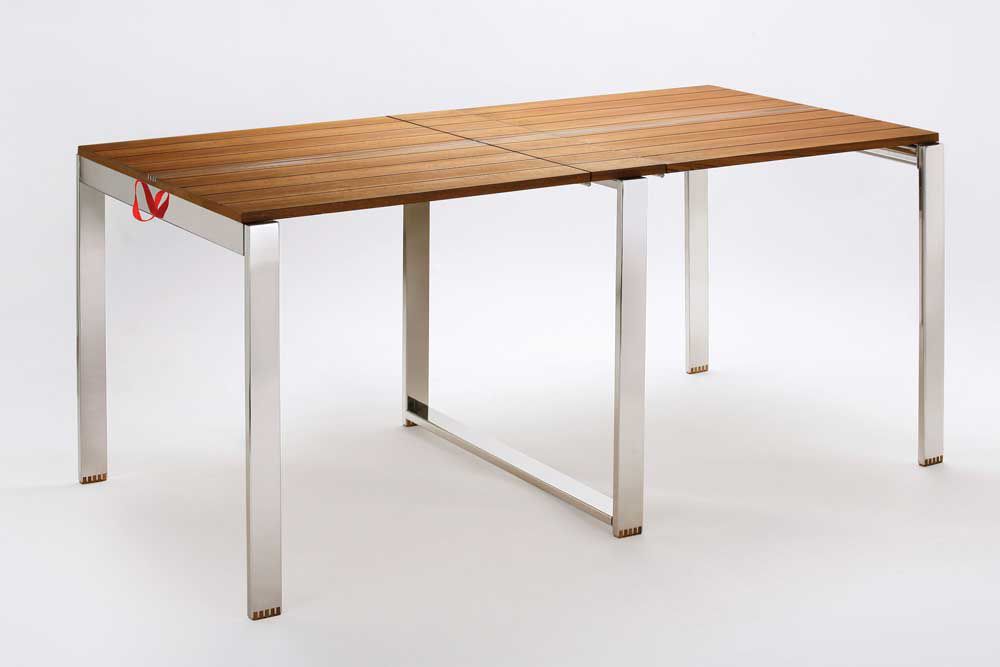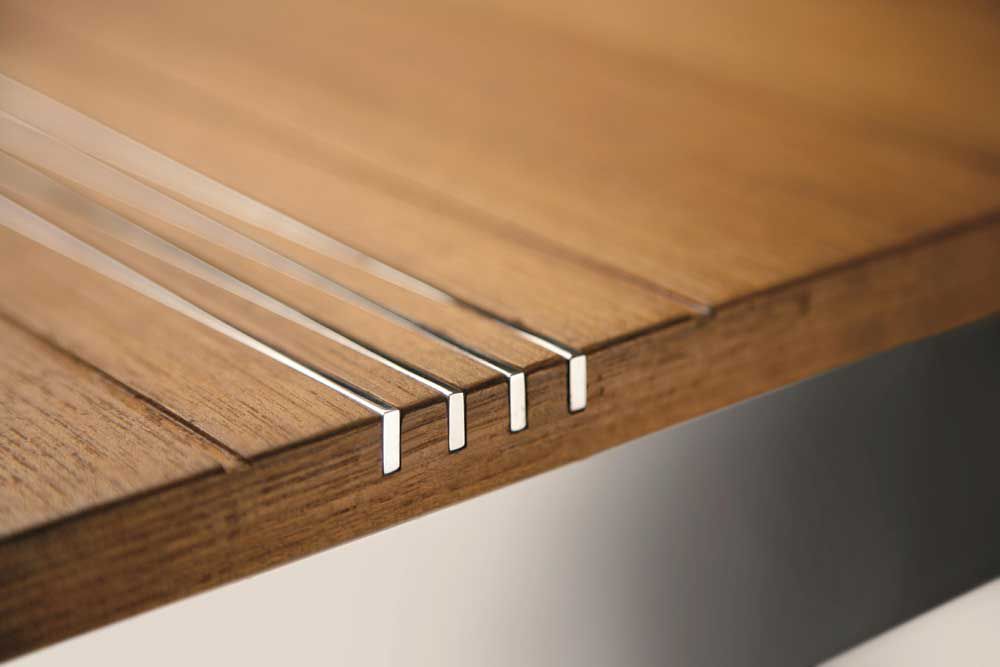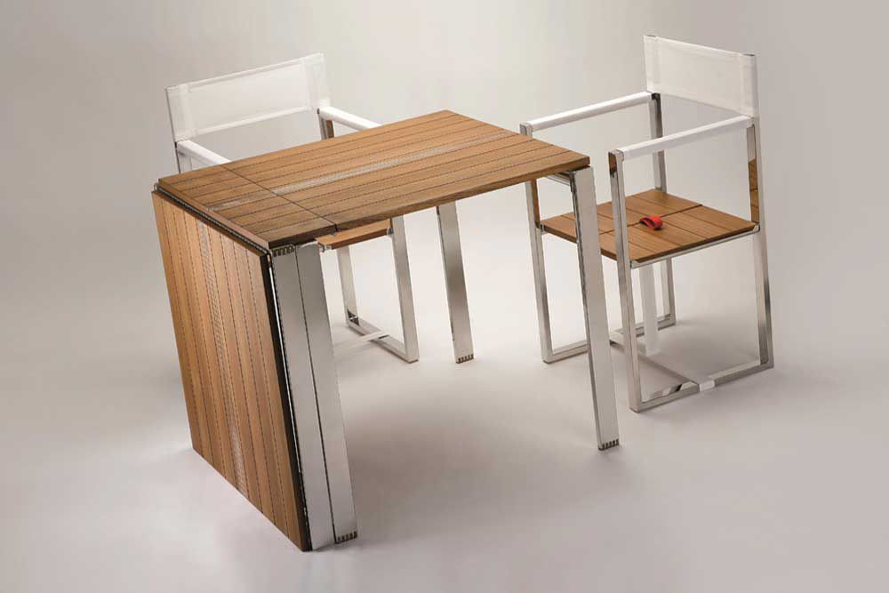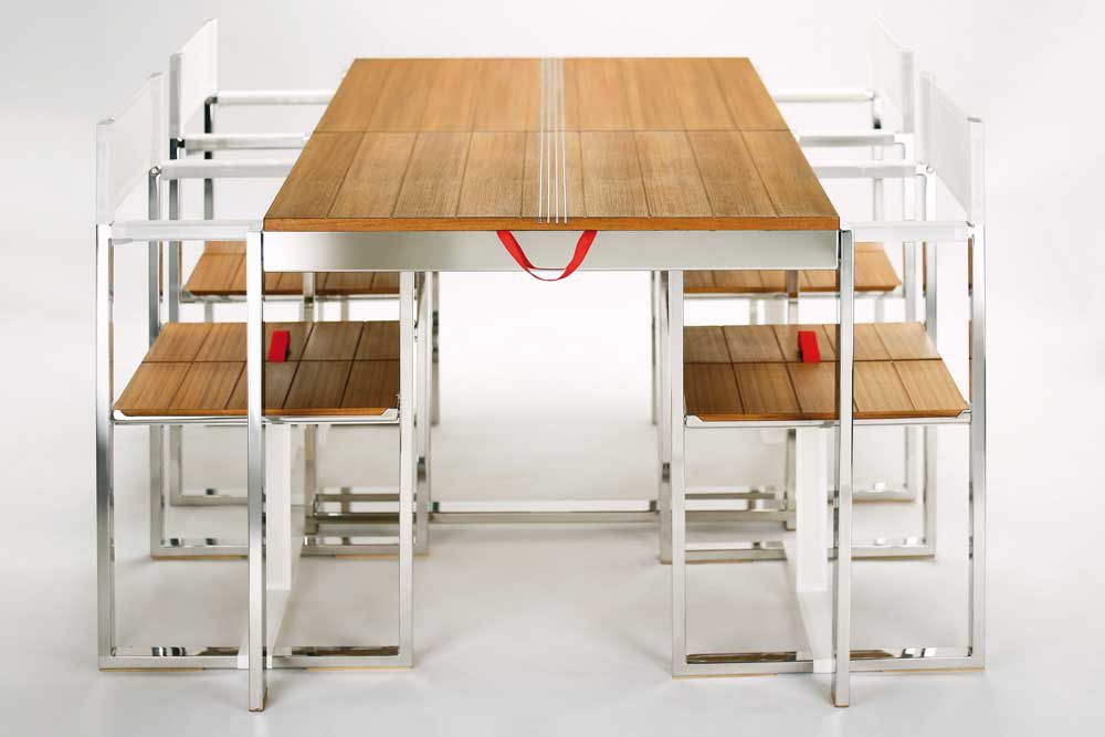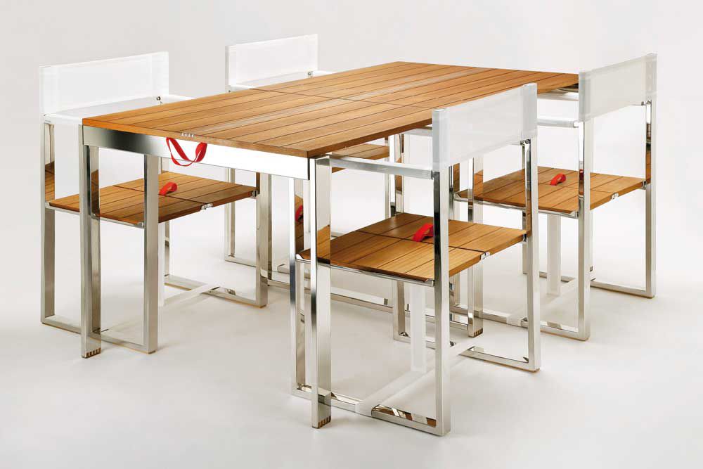 The folding table qui.PACK has a squared tubular 316L hand-polished stainless steel frame and multilayer marine teak wood veneer top, embellished with central 316L stainless steel inserts. A red streamer underlines the innovative opening/closing system of qui.PACK, that can be used wide-opened to achieve a cozy 6 seats table, partially-opened for 3 seats or can convert in a compact and easy-to-carry object.